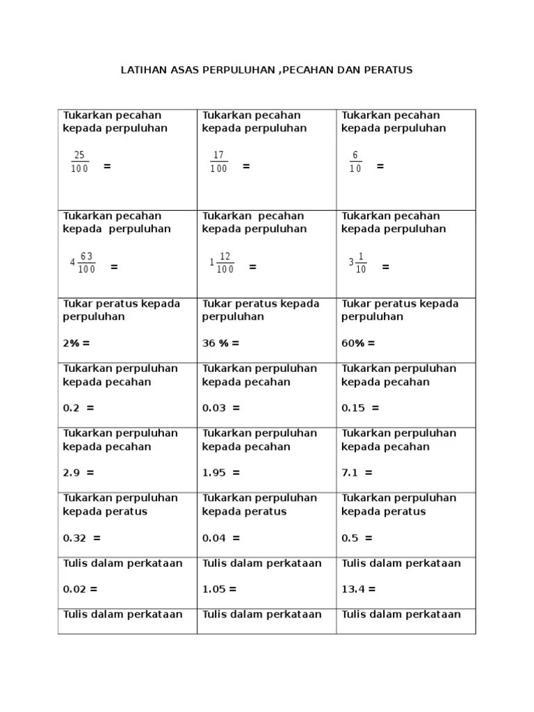 Hitung pembilang pecahan dibahagi dengan penyebut pecahan. Cara pertama untuk menukar pecahan kepada nombor adalah sesuai untuk pecahan yang boleh ditukar kepada nombor iaitu pecahan perpuluhan. Tukar pecahan kepada peratus dengan menggunakan kaedah tukar penyebut kepada per seratus. Pecahan sebagai perpuluhan & peratus. Cikgootubemari belajar cara tukar pecahan kepada perpuluhansubscribe to my channel : Algoritma yang paling mudah melibatkan . Kelas belajar matematik secara percuma di www.vtutor.cikguromie.net.